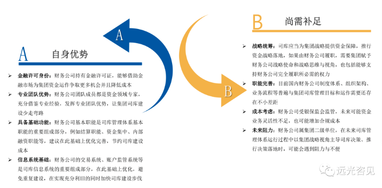 有不少企業(yè)會有困惑,是否可以以財務(wù)公司為基礎(chǔ)構(gòu)建司庫管理體系?這個不建議直接用“是\否”來回答,或許回答“部分可以”會比較適宜。從財務(wù)公司優(yōu)勢和可能存在的不足兩個角度進(jìn)行簡要分析,如圖: