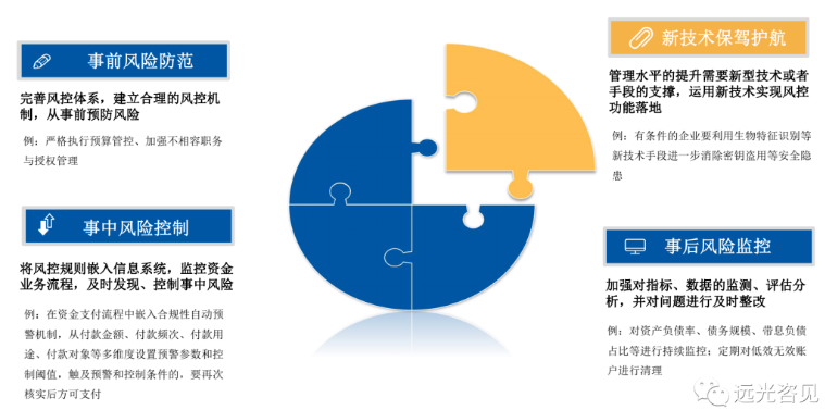 從信息化落地角度加強(qiáng)資金業(yè)務(wù)全面監(jiān)控,建議從四個維度展開:事前風(fēng)險防范、事中風(fēng)險控制、事后風(fēng)險監(jiān)控、新技術(shù)保駕護(hù)航。