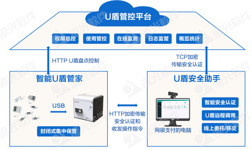 基于以上問題,遠(yuǎn)光軟件推出了全新的U盾安全管控一體化解決方案,通過智能U盾管家、U盾管控平臺、U盾安全助手軟硬一體化的應(yīng)用,對企業(yè)各類銀行U盾進(jìn)行封閉保管、線上授權(quán)、安全認(rèn)證、遠(yuǎn)程調(diào)用、實(shí)時(shí)監(jiān)控、追蹤及統(tǒng)計(jì),實(shí)現(xiàn)了企業(yè)U盾“存放-使用-簽退”全鏈路線上閉環(huán)管理,提升U盾保管及使用的安全性,保障企業(yè)資金管理安全。
