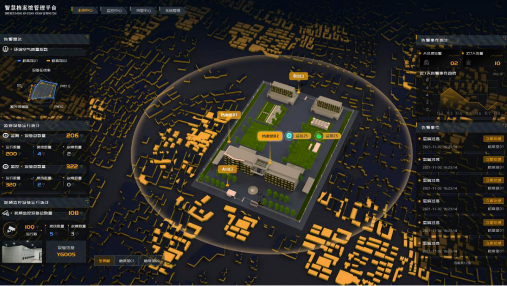 該系統(tǒng)包括了主控中心、監(jiān)控中心、告警中心、管理中心四大模塊:主控中心基于數(shù)字孿生理念,采用3d建模技術(shù),將檔案館的實(shí)時(shí)狀態(tài)、告警信息、統(tǒng)計(jì)分析進(jìn)行實(shí)時(shí)呈現(xiàn);監(jiān)控中心通過(guò)對(duì)檔案館的所有監(jiān)控設(shè)備進(jìn)行實(shí)時(shí)監(jiān)測(cè)與聯(lián)動(dòng)控制,以達(dá)到對(duì)館環(huán)境、安防的管控;告警中心提供了統(tǒng)一的告警引擎以及告警處理功能,可以快速處理系統(tǒng)告警;管理中心主要提供系統(tǒng)管理功能,具有系統(tǒng)基礎(chǔ)配置、數(shù)據(jù)分析的能力。