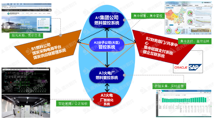在縱向貫通方面,通過在集團(tuán)公司總部部署燃料管控信息系統(tǒng),以集中部署、集中管控為實(shí)施原則,發(fā)揮集團(tuán)公司的計(jì)劃管理和實(shí)施監(jiān)督的管理職能。在分(子)公司部署燃料管控系統(tǒng),作為燃料縱向三級(jí)管控中承上啟下的“橋梁”,對(duì)下屬電廠采購、入廠、結(jié)算實(shí)施監(jiān)管,同時(shí)進(jìn)行區(qū)域內(nèi)調(diào)控;協(xié)助集團(tuán)公司進(jìn)行保供控價(jià)的執(zhí)行,落實(shí)集團(tuán)對(duì)燃料指標(biāo)管控要求。在電廠部署燃料管控信息系統(tǒng)(A2)與燃料智能化系統(tǒng)(A3),作為燃料管控的執(zhí)行主體,內(nèi)容包括入廠計(jì)量過程智能化系統(tǒng)、采制樣過程智能化系統(tǒng)、化驗(yàn)管理網(wǎng)絡(luò)化系統(tǒng)、煤場管理數(shù)字化系統(tǒng)、入爐煤管理系統(tǒng)、門禁系統(tǒng)、燃料集中監(jiān)控系統(tǒng)和監(jiān)控中心、燃料業(yè)務(wù)管理系統(tǒng)。