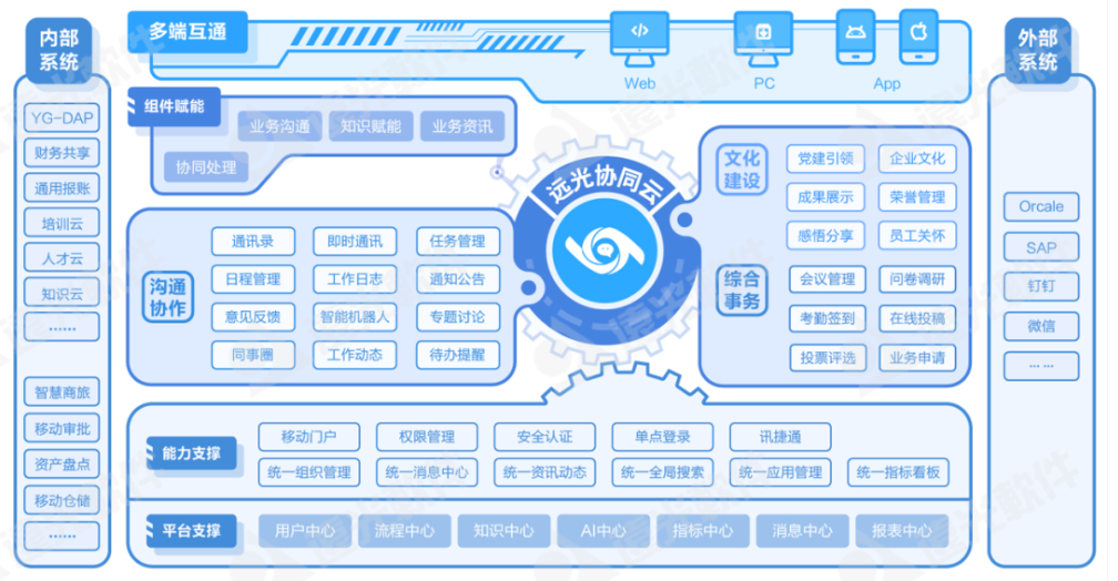 以移動(dòng)端協(xié)同為核心,融合內(nèi)外部應(yīng)用,打造智能化辦公平臺(tái),構(gòu)建社交化、移動(dòng)化、云化、智能化的協(xié)作創(chuàng)新生態(tài)圈。