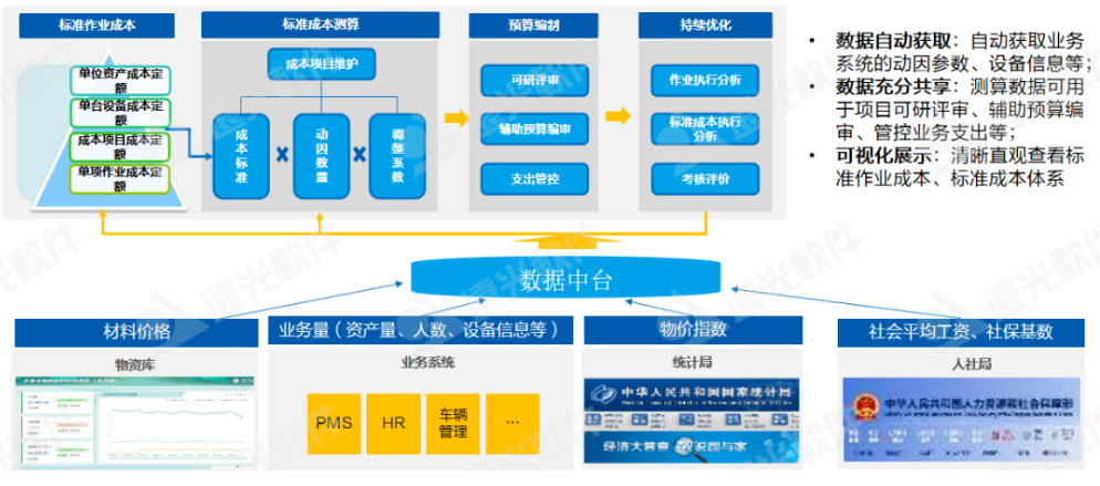遠(yuǎn)光軟件全面預(yù)算管理通過打造涵蓋各板塊、各業(yè)務(wù)的企業(yè)級成本標(biāo)準(zhǔn)庫,輔助企業(yè)預(yù)算編制,提高企業(yè)預(yù)算編制的準(zhǔn)確性及公平性,并通過連接統(tǒng)計局、物價局相關(guān)數(shù)據(jù)指標(biāo),快速采集和更新動因數(shù)據(jù),實現(xiàn)標(biāo)準(zhǔn)成本的動態(tài)修編,提高標(biāo)準(zhǔn)成本體系的適用性、精準(zhǔn)性。