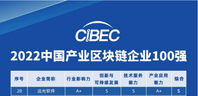 大會根據(jù)該調(diào)研結(jié)果發(fā)布了“2022中國產(chǎn)業(yè)區(qū)塊鏈企業(yè)100強”榜單。榜單評選基于調(diào)研企業(yè)2021年度全年相關(guān)數(shù)據(jù)統(tǒng)計分析與核查比對得出,評選指標由行業(yè)影響力、創(chuàng)新與可持續(xù)發(fā)展、技術(shù)服務能力、產(chǎn)業(yè)應用能力四個一級指標,19個細化統(tǒng)計指標構(gòu)成。遠光軟件從眾多候選企業(yè)中脫穎而出,以S級評分入選百強企業(yè)前列。