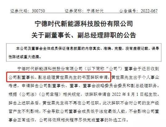 8月1日晚間,寧德時代披露公告稱,公司董事會于近日收到公司副董事長、副總經(jīng)理黃世霖的書面辭職申請,黃世霖出于個人事業(yè)考慮,申請辭去公司副董事長、董事、董事會戰(zhàn)略委員會委員和副總經(jīng)理職務(wù)。辭去上述職務(wù)后,黃世霖將不再在公司任職。