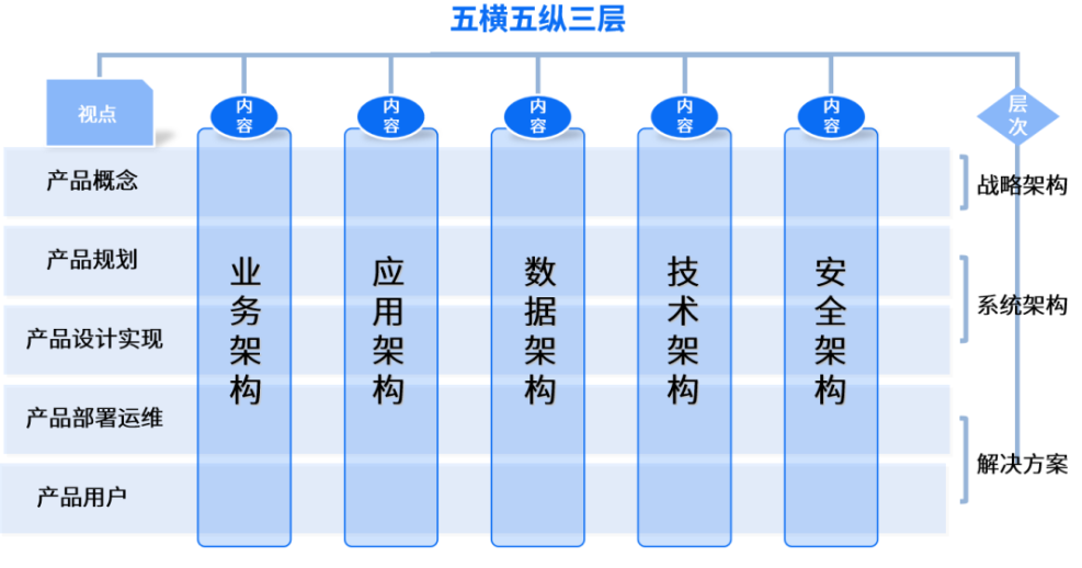 五縱,即縱向包括的五大架構設計——業(yè)務架構、應用架構、數(shù)據(jù)架構、技術架構、安全架構。