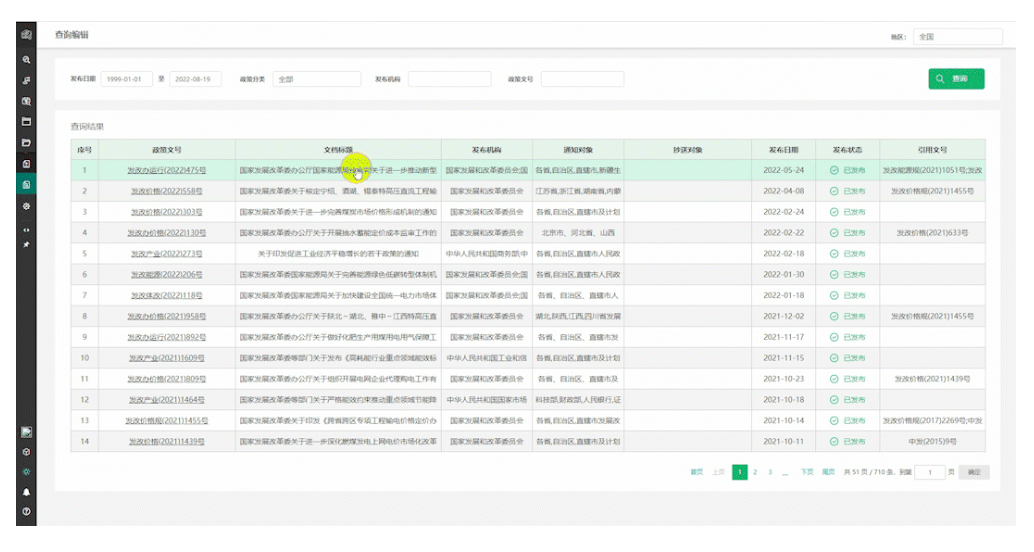 實(shí)現(xiàn)電價(jià)政策從接收、解讀、發(fā)布全過程線上化管理,提供了政策查找、咨詢、稽核與研究全鏈條服務(wù),創(chuàng)新價(jià)格政策的管理模式。