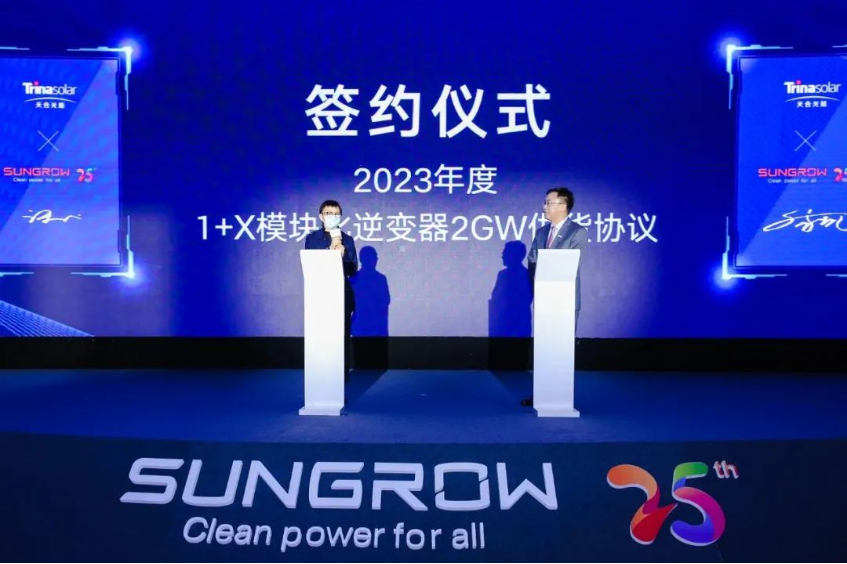 天合智慧能源許凌女士在簽約現(xiàn)場表示:“與陽光電源一樣,天合光能今年也25歲了,雙方一起在光伏行業(yè)砥礪前行,都取得了長足的發(fā)展。多年來,我們見證陽光電源始終保持著蓬勃的創(chuàng)新活力和高質(zhì)量的產(chǎn)品輸出。這次與陽光電源簽訂了2GW的‘1+X’模塊化逆變器供貨協(xié)議,期待用陽光的逆變新品,打造出更好的光伏電站。”