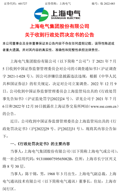 上海電氣12月25日晚間公告稱,近日,公司收到上海證監(jiān)局出具的《行政處罰決定書》,因未及時(shí)披露相關(guān)重大事件、2020年年報(bào)存在虛假記載,被警告并罰款500萬(wàn)元;對(duì)上海電氣副總裁、電氣通訊董事長(zhǎng)陳干錦給予警告,并處50萬(wàn)元罰款。