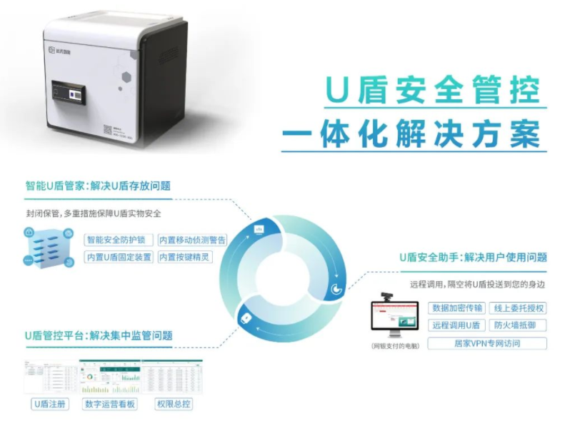 遠光智能U盾管家通過運用“人工智能+物聯(lián)網(wǎng)”技術,以軟硬一體化的形式打造U盾安全管控一體化解決方案,對企業(yè)各類銀行U盾進行封閉保管、線上授權、安全認證、遠程調(diào)用、實時監(jiān)控、追蹤及統(tǒng)計,實現(xiàn)了企業(yè)U盾“存放-使用-簽退-存放”全鏈路的線上閉環(huán)管理,從而提升了U盾的保管、使用及操作的安全性,為企業(yè)安全保駕護航。