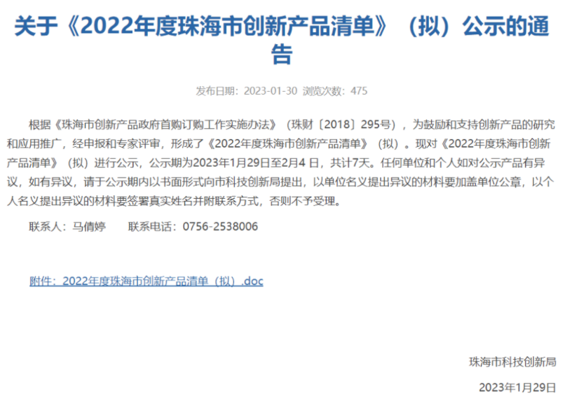 《2022年度珠海市創(chuàng)新產(chǎn)品清單》,是根據(jù)《珠海市創(chuàng)新產(chǎn)品政府首購訂購工作實施辦法》(珠財〔2018〕295號),經(jīng)企業(yè)申報和專家評審而來,旨在為鼓勵和支持創(chuàng)新產(chǎn)品的研究和應用推廣。