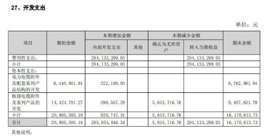 開(kāi)發(fā)支出方面,費(fèi)用性支出2841萬(wàn)元,資本性支出92萬(wàn)元,包括電力電纜附件及配套系列產(chǎn)品結(jié)構(gòu)的開(kāi)發(fā)年度支出32萬(wàn)元,核級(jí)電纜附件及系列產(chǎn)品的開(kāi)發(fā)年度支出60萬(wàn)元。具體見(jiàn)下表。