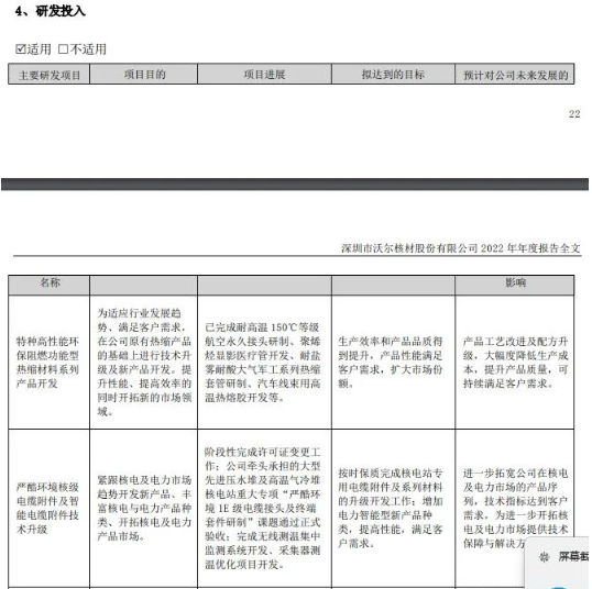 主要研發(fā)項(xiàng)目包括特種高性能環(huán)保阻燃功能型熱縮材料系列產(chǎn)品開(kāi)發(fā)項(xiàng)目、嚴(yán)酷環(huán)境核級(jí)電纜附件及智能電纜附件技術(shù)升級(jí)項(xiàng)目。具體見(jiàn)下表。