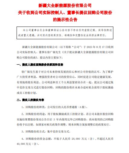 大全能源8月17日公告,公司實際控制人、董事長徐廣福提議以不低于2億元且不超過4億元集中競價交易回購公司已發(fā)行的股票,回購價格不超過50元/股,用于股權(quán)激勵或員工持股計劃。