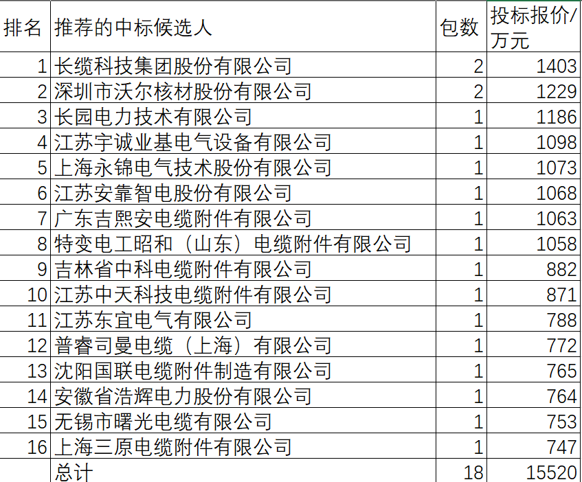 根據(jù)此前(2024年3月7日)推薦的中標(biāo)候選人公示,共招18包15520萬(wàn)元,16家供應(yīng)商中標(biāo)。長(zhǎng)纜科技、沃爾核材中標(biāo)2包,其余供應(yīng)商中標(biāo)1包。中標(biāo)金額分布較為均衡,10家過(guò)800萬(wàn)元,8家過(guò)1000萬(wàn)元,長(zhǎng)纜科技最高,1403萬(wàn)元,三原電纜附件最低,747萬(wàn)元。