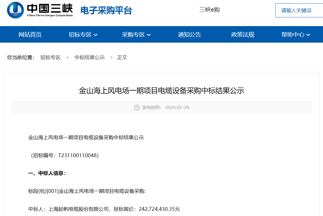 2024年7月29日,中國三峽電子采購平臺發(fā)布《金山海上風(fēng)電場一期項目電纜設(shè)備采購中標結(jié)果公示》的公告。