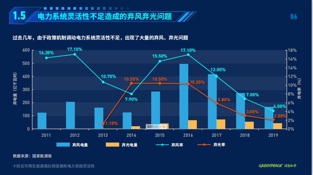 目前,中國(guó)以煤電為主的電力系統(tǒng)靈活性嚴(yán)重不足,電力系統(tǒng)的僵化導(dǎo)致了棄風(fēng)、棄光問題的出現(xiàn)。2011-2019年,中國(guó)的棄風(fēng)和棄光率一度高達(dá)17.1%和10.5%,造成了大量發(fā)電資源的浪費(fèi)。2016-2018年間,中國(guó)棄風(fēng)和棄光電量共計(jì)1389億千瓦時(shí) ,相當(dāng)于約3000萬千瓦煤電廠的發(fā)電量。