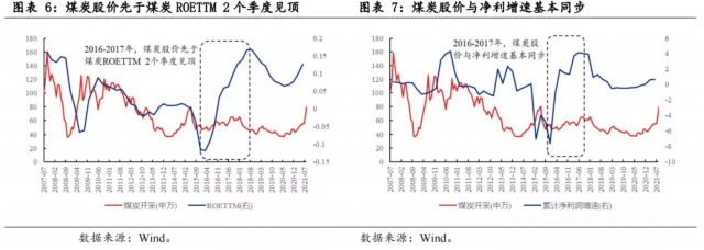 供給壓縮主導(dǎo)的煤炭價格上漲,股價與基本面相關(guān)性更高,累計凈利增速可能是更重要的觀測變量。2016-2017年煤炭股價的上漲與基本面基本同步,從時間維度來看,那輪行情中,煤炭股價提前于煤炭股ROE 2個季度見頂,2017年三季度至2018年三季度,煤炭股ROE持續(xù)上漲,但煤炭股價相對全A收益率卻為-6.14%。與之形成對比的是,2017年三季度煤炭股凈利潤增速與煤炭股價同步見頂,隨后的一年內(nèi)雖保持在70%以上的高位,但煤炭股價依舊下滑。