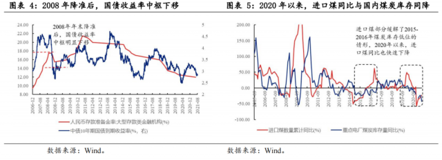 2020年以來,進(jìn)口煤數(shù)量與國內(nèi)煤炭庫存同降,煤炭價格上漲持續(xù)時間可能比第二輪更長。2015-2016年,雖然國內(nèi)煤炭庫存同比處于低位,但進(jìn)口煤數(shù)量同比持續(xù)攀升,可能部分彌補(bǔ)了國內(nèi)煤炭的數(shù)量。而2020年以來,進(jìn)口煤炭數(shù)量與國內(nèi)煤炭庫存同步下滑,并且下滑的幅度要高于2015-2016年,疊加碳中和的長期政策,國內(nèi)煤炭價格上漲的持續(xù)時間可能比第二輪更長。
