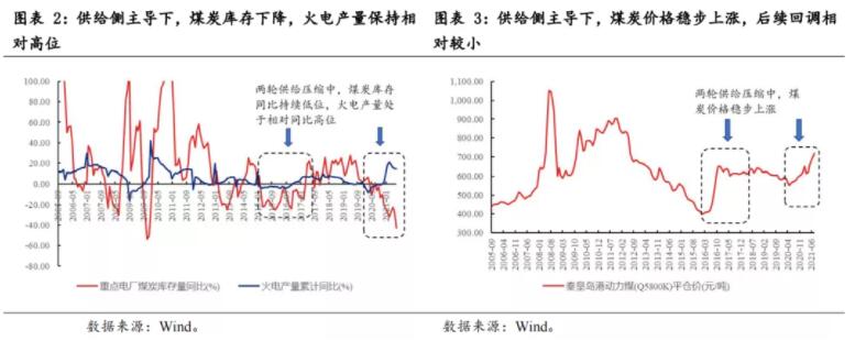2008年以來,共有三輪煤炭價格持續(xù)上漲區(qū)間,第一輪的上漲動力是中國四萬億刺激政策落地,流動性和需求主導(dǎo),第二輪為供給側(cè)改革,供給壓縮主導(dǎo),第三輪為需求復(fù)蘇+供給壓縮主導(dǎo)。
