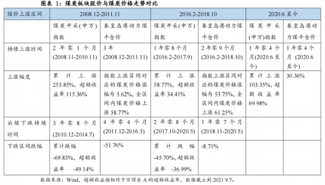 庫存同比低位+火電產(chǎn)量同比相對高位是煤炭價格和煤炭股啟動信號。2016年的煤炭股行情與今年都是在供給側(cè)壓縮下主導(dǎo),在兩輪行情的起步階段,煤炭庫存同比均已經(jīng)過一段時間的下滑,與此同時,火電產(chǎn)量同比保持在相對高位,如圖2中火電產(chǎn)量同比始終高于煤炭庫存同比。在供給側(cè)主導(dǎo)的行情中,煤炭價格穩(wěn)步上漲,煤炭股與煤炭價格的啟動時間同比,煤炭價格保持在相對高位,煤價后續(xù)回調(diào)的幅度較小,例如供給側(cè)改革后的2018年11月至2020年5月,煤炭價格下跌幅度不足10%。