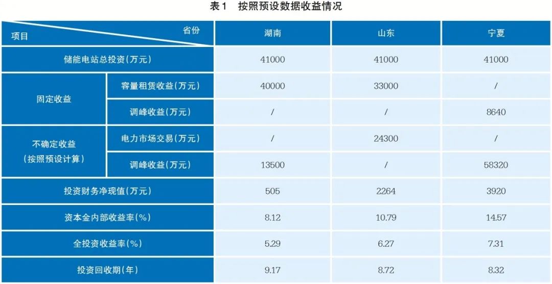對三省不確定收益預(yù)設(shè)補償金額和調(diào)用次數(shù),湖南輔助服務(wù)調(diào)峰價格在250元/兆瓦時,調(diào)用次數(shù)為年300次;山東電力市場交易放電上限價格0.5元/千瓦時,充電下限價格0.2元/千瓦時,年充放電次數(shù)600次;寧夏輔助服務(wù)調(diào)峰補償價格0.6元/千瓦時,年調(diào)用次數(shù)600次,預(yù)估收益情況如表1所示。