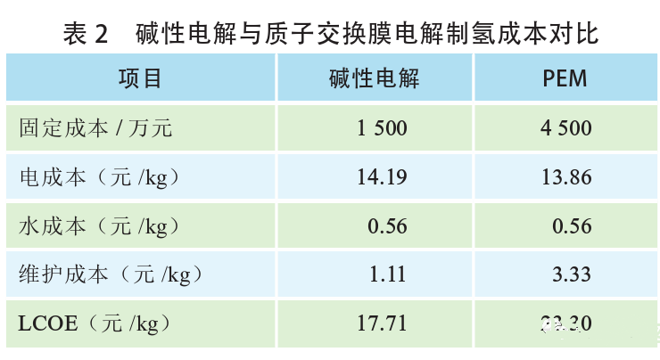 以堿性電解和PEM電解項(xiàng)目(1000Nm3/h)為例,假設(shè)項(xiàng)目全生命周期為20年,運(yùn)行壽命9萬h,固定成本包裹電解槽、氫氣純化裝置、材料費(fèi)、土建費(fèi)、安裝服務(wù)費(fèi)等項(xiàng)目,電解以0.3元/kWh計(jì)算,成本對(duì)比見表2。