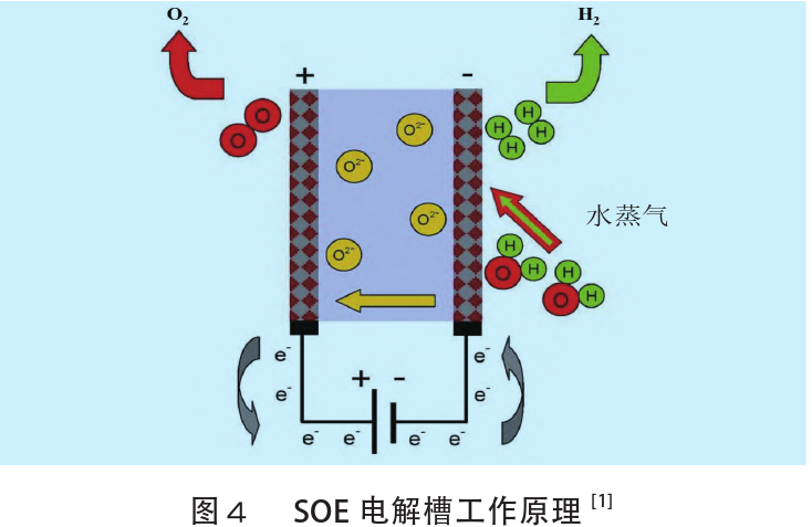 固體氧化物電解槽(SOE)利用高溫水蒸氣(600~900℃)電解,效率高于堿性電解槽和PEM電解槽。20世紀(jì)60年代,美國和德國就開始進(jìn)行SOE高溫水蒸氣的相關(guān)研究。SOE電解槽的工作原理如圖4所示。循環(huán)氫氣和水蒸氣從陽極進(jìn)入反應(yīng)系統(tǒng),水蒸氣在陰極電解成氫氣,陰極產(chǎn)生的O2–通過固體電解質(zhì)移動(dòng)到陽極,重新結(jié)合形成氧氣并釋放電子。