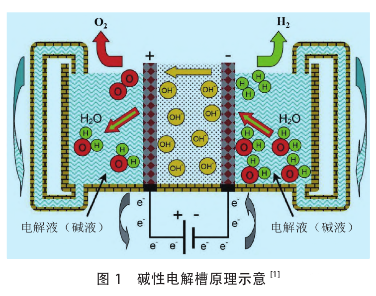 堿性電解槽的工作原理如圖1所示。電池由兩個(gè)電極組成,兩個(gè)電極由氣密隔膜分開。電池裝配時(shí)浸沒在高濃度的堿性液體電解質(zhì)KOH(20%~30%)中,使離子電導(dǎo)率最大化,NaOH和NaCl溶液也可作電解液,但不常用,電解液的主要缺點(diǎn)是具有腐蝕性。電解槽的工作溫度為65~100℃,電解槽陰極產(chǎn)生氫氣,生成的OH–通過隔膜流向陽極,在陽極表面重新結(jié)合產(chǎn)生氧氣。先進(jìn)的堿性電解槽適合大規(guī)模制氫,一些制造商制造的堿性電解槽在(500~760Nm3/h)具有非常高的產(chǎn)氫能力,相應(yīng)的耗電量為2150~3534kW。