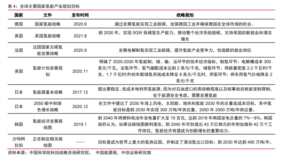 全球氫能發(fā)展相對領(lǐng)先的地區(qū)有美國、歐洲、日韓,而沙特阿拉伯、阿聯(lián)酋等中東國家也瞄準(zhǔn)了氫能,沙特阿拉伯雖未發(fā)表書面文件,但是已經(jīng)提出了氫能戰(zhàn)略目標(biāo)。
