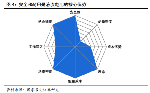 液流電池具備兩大核心優(yōu)勢:1)安全:從根本上避免爆燃,2)耐用:活性物質(zhì)衰減緩慢,工作壽命長達15-20年,加之儲能系統(tǒng)一般是靜態(tài)設(shè)施,對重量、體積的要求不高,能量密度并非關(guān)鍵指標(biāo),使得其尤其適合作為大規(guī)模儲能系統(tǒng)。