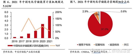 我國電化學(xué)儲能裝機(jī)規(guī)模持續(xù)高速增長,其中鋰電池儲能規(guī)模占比超九成。2021年,中國電化學(xué)儲能累計裝機(jī)規(guī)模5.1GW,同比增長56.5%,2016-2021年CAGR高達(dá)79.3%。其中,鋰離子電池儲能技術(shù)裝機(jī)規(guī)模4.7GW,裝機(jī)規(guī)模占比91.0%;鉛蓄電池儲能裝機(jī)規(guī)模0.3GW,占比5.5%;液流電池儲能技術(shù)裝機(jī)規(guī)模0.1GW,占比2.9%。