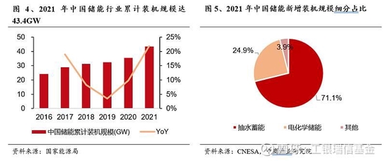 我國儲能市場穩(wěn)步擴(kuò)容,電化學(xué)儲能份額增長明顯。在新能源發(fā)電規(guī)模大幅增長的推動下,我國儲能裝機(jī)規(guī)模一直保持高速增長的趨勢。根據(jù)國家能源局?jǐn)?shù)據(jù),2021年中國儲能市場累計裝機(jī)功率位居全球第一,為43.4GW,同比增長21.9%,2016-2021年儲能累計裝機(jī)量年均復(fù)合增長率為12.3%。2021年我國抽水蓄能新增裝機(jī)5.2GW,占比71.1%;電化學(xué)儲能新增裝機(jī)1.8GW,占比24.9%,較2020年占比9.2%增幅較大,電化學(xué)儲能市場份額增長明顯。