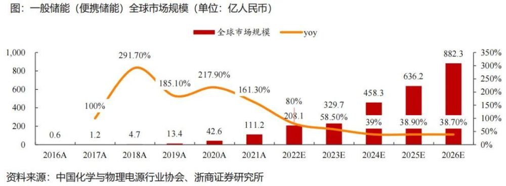 一般儲(chǔ)能/便攜儲(chǔ)能:適用于①戶外旅行場(chǎng)景,為手機(jī)/電腦等供電,滿足戶外旅行多樣化便攜需求;②應(yīng)急備災(zāi)等場(chǎng)景,在地震、海嘯多發(fā)地區(qū),可與太陽(yáng)能電板構(gòu)成小型發(fā)電系統(tǒng),滿足災(zāi)民用電需求。根據(jù)中國(guó)化學(xué)與物理電源行業(yè)協(xié)會(huì)數(shù)據(jù),預(yù)計(jì)至2026年市場(chǎng)規(guī)模有望達(dá)882億人民幣。具體如下圖所示: