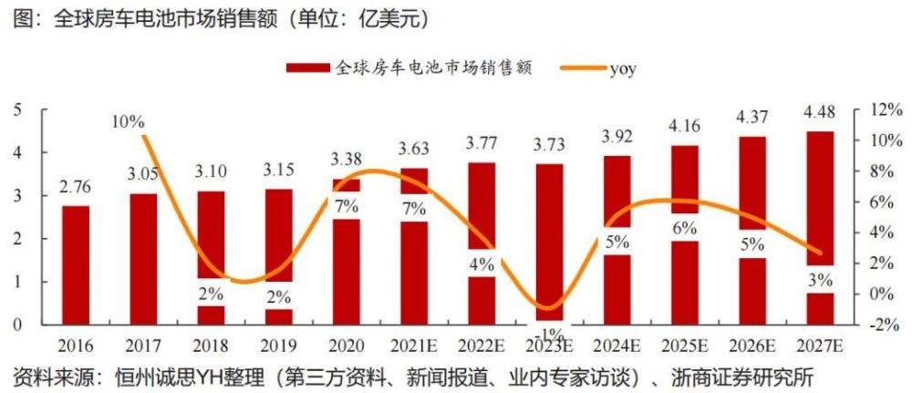 房車(chē)儲(chǔ)能:鉛酸電池儲(chǔ)能系統(tǒng)相對(duì)成熟,已被成品房車(chē)大量使用;近幾年趨勢(shì)會(huì)加配折疊太陽(yáng)能電池板,備用發(fā)電。根據(jù)恒州誠(chéng)思數(shù)據(jù),預(yù)計(jì)2026年房車(chē)用電池市場(chǎng)銷(xiāo)售額4.37億美元;伴隨儲(chǔ)能系統(tǒng)迭代升級(jí),房車(chē)儲(chǔ)能有較大機(jī)會(huì)。具體如下圖所示: