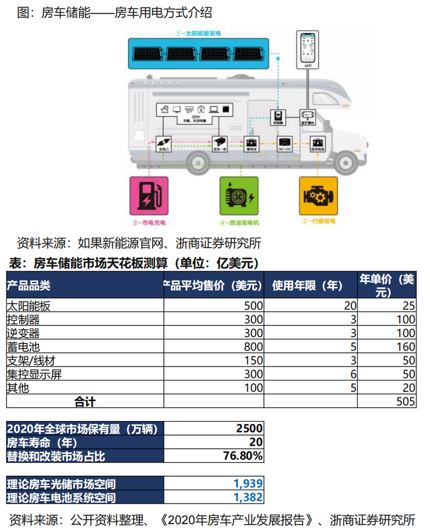 房車(chē)儲(chǔ)能伴隨房車(chē)出貨量分布,目前仍以歐美為主市場(chǎng)為主。伴隨儲(chǔ)能系統(tǒng)迭代升級(jí),房車(chē)儲(chǔ)能有較大機(jī)會(huì),理論房車(chē)光儲(chǔ)市場(chǎng)天花板預(yù)計(jì)1939億美金。具體如下圖所示: