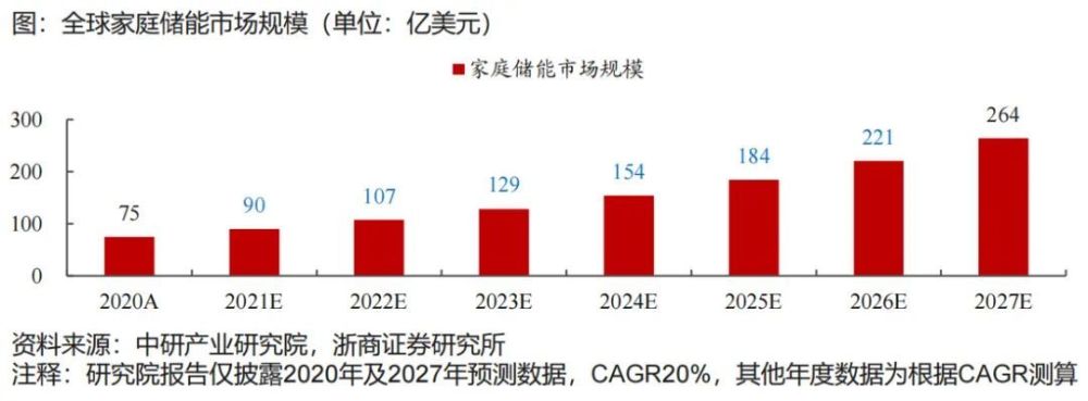 家庭儲(chǔ)能:由于海外電價(jià)昂貴+電網(wǎng)穩(wěn)定性有待提升,根據(jù)中研產(chǎn)業(yè)研究院發(fā)布,2020年全球家庭儲(chǔ)能規(guī)模約75億美元,預(yù)計(jì)至2027年達(dá)264億美金,cagr20%。具體如下圖所示: