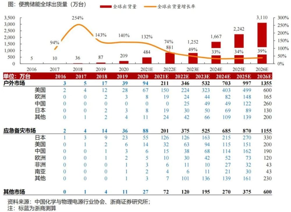 便攜儲(chǔ)能,全球出貨量快速增長(zhǎng),根據(jù)中國(guó)化學(xué)與物理電源協(xié)會(huì)數(shù)據(jù)測(cè)算,預(yù)計(jì)20-26年CAGR為57%;按照不同需求用途又分為三類(lèi):