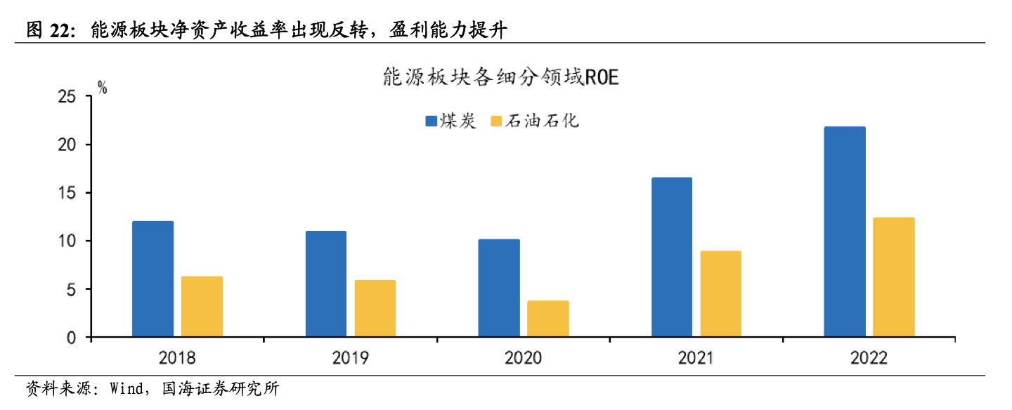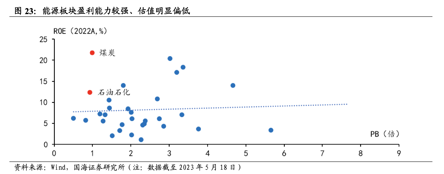 國海證券6月8日研報(bào)表示,能源板塊中上市公司擁有較為優(yōu)質(zhì)的基本面和偏低的市場估值,處于優(yōu)質(zhì)資產(chǎn)被低估的狀態(tài)。根據(jù)國海證券6月8日研報(bào)測算,截止到5月24日,石油石化、煤炭、公用事業(yè)2022年全年的ROE分別為12.32%、21.74%、5.59%,盈利能力較強(qiáng),且PB十年分位分別為 8.3%、35.9%、37.8%,能源是優(yōu)質(zhì)資產(chǎn)被低估的主要領(lǐng)域,調(diào)整過后仍具備性價比。
