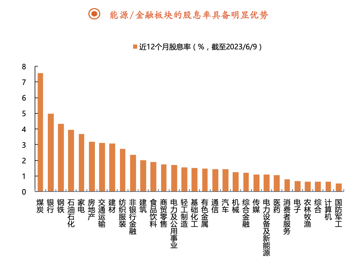 與此同時,平安證券研報(bào)指出,在“中特估+分紅”細(xì)分主線下能源領(lǐng)域有望顯著受益。根據(jù)近12個月股息率(截至2023/6/9),能源股息率具備明顯優(yōu)勢,煤炭、鋼鐵、石油化工股息率均位列前五。