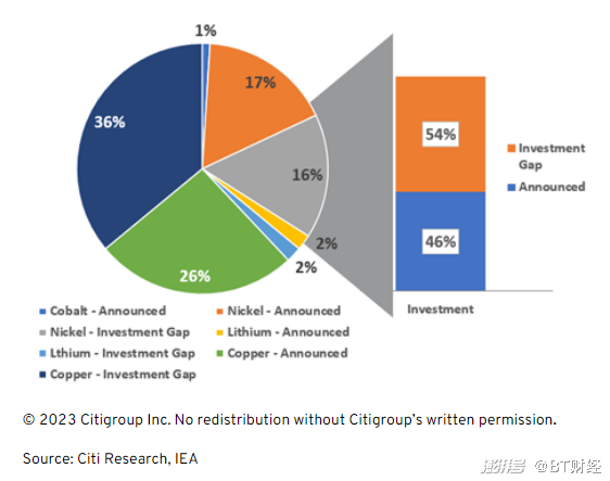 根據(jù)國際能源署(IEA)的數(shù)據(jù),關鍵礦產(chǎn)所需的投資在3600億至4500億美元之間。考慮到已宣布的項目,目前的投資缺口為54%,即1940億美元至2430億美元。目前,投資缺口最大的礦產(chǎn)是銅,占36%,其次是鎳,占16%。