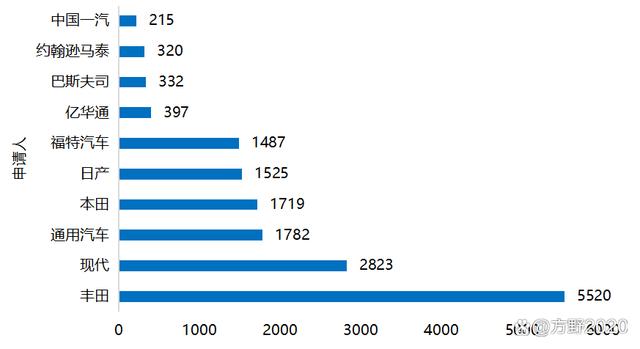 全球車用氫能技術領域?qū)@暾埩颗琶笆纳暾埲巳鐖D6所示。從圖中可以看到,目前車用氫能技術主要掌握在眾多車企手中,其中較典型的如日本豐田和本田、韓國現(xiàn)代、美國通用和福特以及中國一汽,而北京億華通作為唯一的非車企型企業(yè)列入其中,具有較佳的研發(fā)實力。