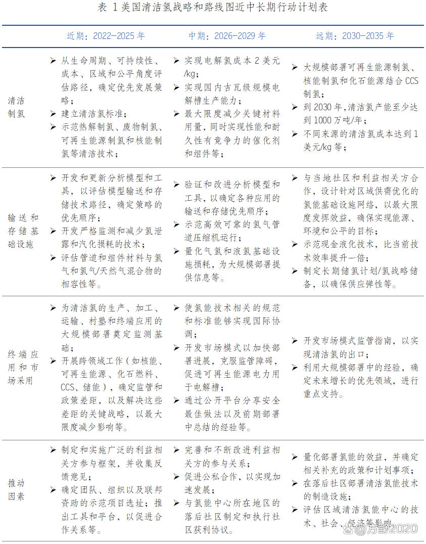 美國是最早發(fā)展氫能的國家,多年來始終將氫能作為重要能源戰(zhàn)略儲備技術,持續(xù)支持氫能全產(chǎn)業(yè)鏈技術研發(fā),并加快示范創(chuàng)建和戰(zhàn)略部署,以期實氫能產(chǎn)業(yè)規(guī)模化發(fā)展。2021年7月美國能源部(以下簡稱“DOE”)宣布投資5250萬美元用于綠氫技術的研發(fā),這筆資金將惠及多項氫能研發(fā)項目,旨在十年內(nèi)將氫能成本降低80%,達到每千克1美元。11月DOE又發(fā)布《碳中性氫能技術基礎科學》研發(fā)指南,明確了高效新型電解水制氫、氫機理等4個優(yōu)先研發(fā)方向。2022年2月,DOE下屬化石能源和碳管理辦公室宣布2800萬美元的聯(lián)邦資金,用于推動綠氫作為一種無碳燃料用于交通、工業(yè)和電力生產(chǎn)。2022年11月,DOE發(fā)布《國家清潔氫能戰(zhàn)略和路線圖(草案)》,制定2022-2035年近、中、長期清潔氫能發(fā)展行動時間表,如表1所示,明確在制氫、儲氫、運氫及終端應用的各階段發(fā)展目標。此外,美國于2023年6月發(fā)布首個國家能源戰(zhàn)略規(guī)劃路線圖。