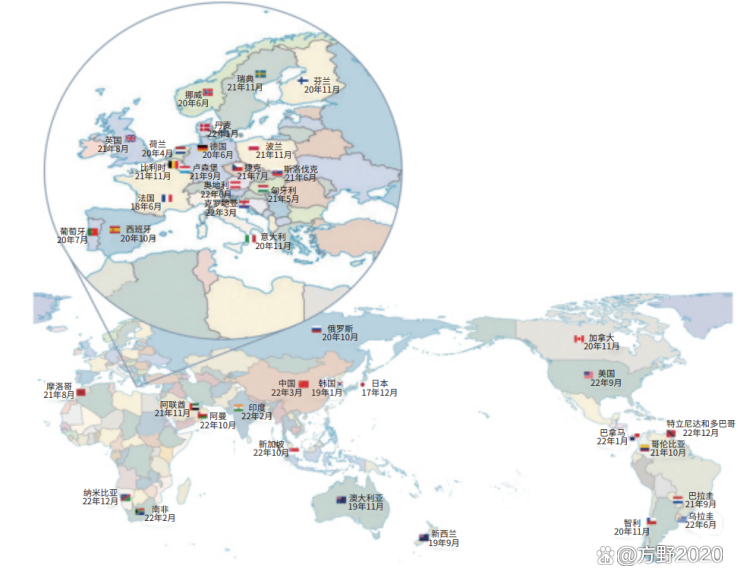 氫能是一種來源豐富、綠色低碳、應用廣泛的二次能源,正逐步成為全球應對氣候變化和能源轉(zhuǎn)型發(fā)展的重要抓手。隨著全球新一輪科技革命和產(chǎn)業(yè)變革蓬勃興起,新興能源技術以前所未有的速度加快迭代,助推氫能產(chǎn)業(yè)快速發(fā)展。據(jù)國際氫能源委員會預測,到2030年全球氫能領域投資總額將達5000億美元,而2050年全球氫能產(chǎn)業(yè)鏈產(chǎn)值將超過2.5萬億美元。在此背景下,目前已有超過40多個國家和地區(qū)制定了國家氫能發(fā)展戰(zhàn)略,積極培育氫能及燃料電池技術攻關和產(chǎn)業(yè)發(fā)展,如圖1所示。在推動氫能發(fā)展的過程中,各國根據(jù)自身資源稟賦、產(chǎn)業(yè)基礎、市場訴求等因素,分階段、分領域推進氫能發(fā)展戰(zhàn)略,并在實踐中不斷完善,已經(jīng)形成各具特色的發(fā)展模式。