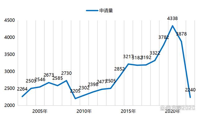 本報告專利文獻數(shù)據(jù)均來自INCOPAT全球?qū)@麛?shù)據(jù)庫,本節(jié)車用氫能專利檢索數(shù)據(jù)采集時間段為2003年1月1日至2022年12月31日,涵蓋了整車集成、質(zhì)子交換膜燃料電池系統(tǒng)以及氫內(nèi)燃機相關的專利技術,專利申請趨勢如圖4所示。總計專利數(shù)據(jù)57191條,其中以簡單同族合并方式處理后共計41338件。