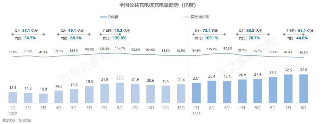 從公樁使用情況上看,隨著新能源汽車保有量的快速增長,公樁充電量持續(xù)增長,今年1-8月充電量已超過去年全年充電量之和。今年新能源汽車銷量持續(xù)高漲,滲透率不斷提高,隨之帶來的是新能源用車出行需求快速增長,使得全國公共充電樁充電量在7、8兩個(gè)月內(nèi)連續(xù)超越30億度大關(guān)。