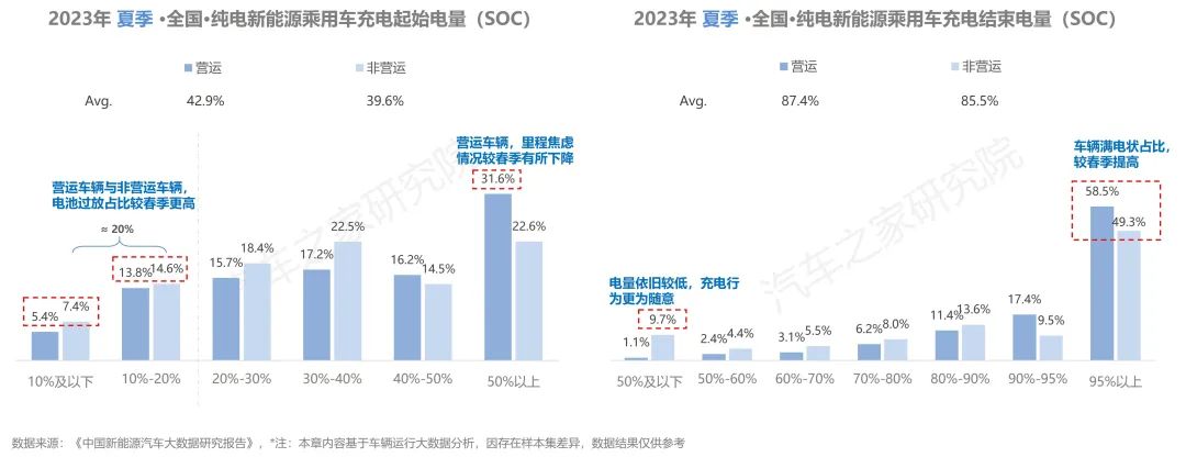 從充電開始電量上看,在夏季營運(yùn)與非營運(yùn)車輛均有相當(dāng)比例的車輛存在電池過放有害電池健康的現(xiàn)象,這一情況的比例較春季明顯增加。同時(shí),在剩余電量在50%以上就開始充電的車主數(shù)量較春季有明顯下降,營運(yùn)車輛與家用車輛車主對(duì)里程焦慮感有所減弱。