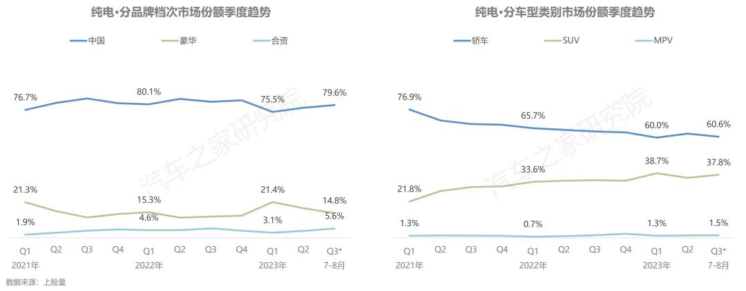 而從車型的角度上看,新能源純電市場(chǎng)產(chǎn)品結(jié)構(gòu)暫時(shí)趨于穩(wěn)定,轎車占據(jù)六成的市場(chǎng)份額,是絕對(duì)的主力車型,SUV車型占據(jù)近40%的市場(chǎng)空間,但發(fā)展態(tài)勢(shì)正在處于上升通道之中,MPV車型市場(chǎng)空間持續(xù)穩(wěn)定在相對(duì)微小的水平。
