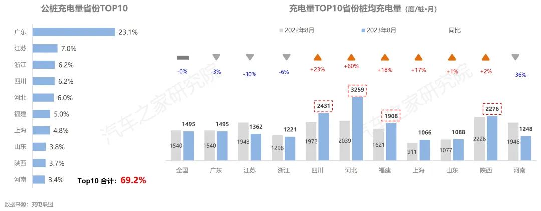 從各省份充電量上看,廣東省擁有全國22%的公共樁,充了全國23.1%的電量,在充電量方面同樣成為當(dāng)之無愧的王者。