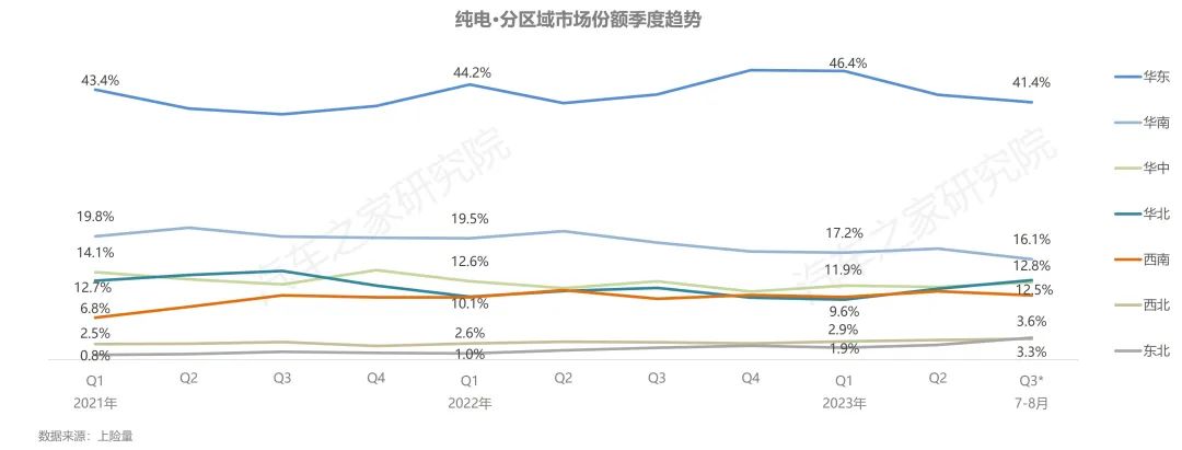 從區(qū)域角度上看,以長三角為代表的華東地區(qū)是中國發(fā)展的重要引擎,匯聚多個(gè)經(jīng)濟(jì)發(fā)達(dá)的省、市,更高的本地居民收入與完善的充電基礎(chǔ)設(shè)施配套,促使當(dāng)?shù)叵M(fèi)者對(duì)新能源純電汽車更加旺盛的購車需求,其市場(chǎng)份額長期保持在40%以上,成為新能源純電車型最為重要的區(qū)域市場(chǎng);華南地區(qū)以16%左右的份額位居第二;華中、華北、西南市場(chǎng)占比均在12%左右,份額十分相近;西北、東北市場(chǎng)占比尚不足5%。